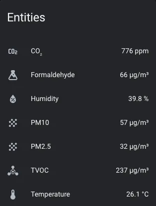 formaldehyde (Required): The information for the formaldehyde sensor. Readings in µg/m³.